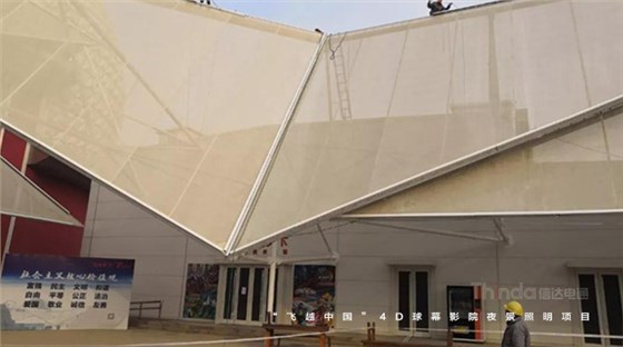 影院高32.8米,總占地總面積3600平方米。外觀的球形頂,代表著神秘浩瀚的宇宙和閃爍星空,神秘又等待著探索。外圍建筑狀似飛翼,采用的是鋼絲膜強化來建筑造型,展現建筑“飛躍”之勢,正與“飛越中國”這一主題相契合!