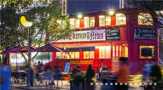 西安創業咖啡街區是西部的投資熱土和創業天堂,為打造創新創業新地標,信達電通通過明與暗、動與靜、冷與暖、光與影的對比,為西安創業咖啡街區夜景提升設計創造出具有層次感的燈光環境。周圍建筑與景觀改造形成統一步調,咖啡杯、水滴景觀、咖啡豆等景觀裝置和雙層咖啡巴士的創新設計提升咖啡街區的趣味性和藝術性,打造年輕、時尚、有活力的空間,形成西安新地標。