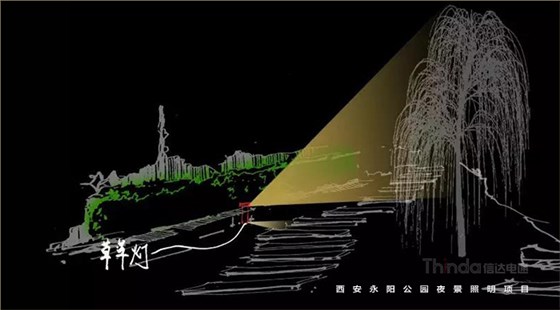 對于茂盛的樹木,建議從外部進行面光照射,勾勒出樹木的形狀也強調了其質感。草坪燈和投光相結合的燈具,既滿足道路照明又能將樹木打亮;