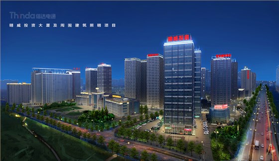 明威投資大廈的樓體照明中,信達電通設計師用“面光”替代“線光”,改善原有的照明缺失,點亮了明威投資大廈和周圍建筑群的建筑頂部,增加了整體的夜景照明效果,明威投資大廈建筑中部選用了層層排列的玻璃窗LED燈,周圍兩側的建筑分別采用了隱藏式LED流光燈和洗墻燈,凸顯每棟建筑的特色,建筑底部全部選用黃色投光燈,在夜色中給人一種溫暖的感受。